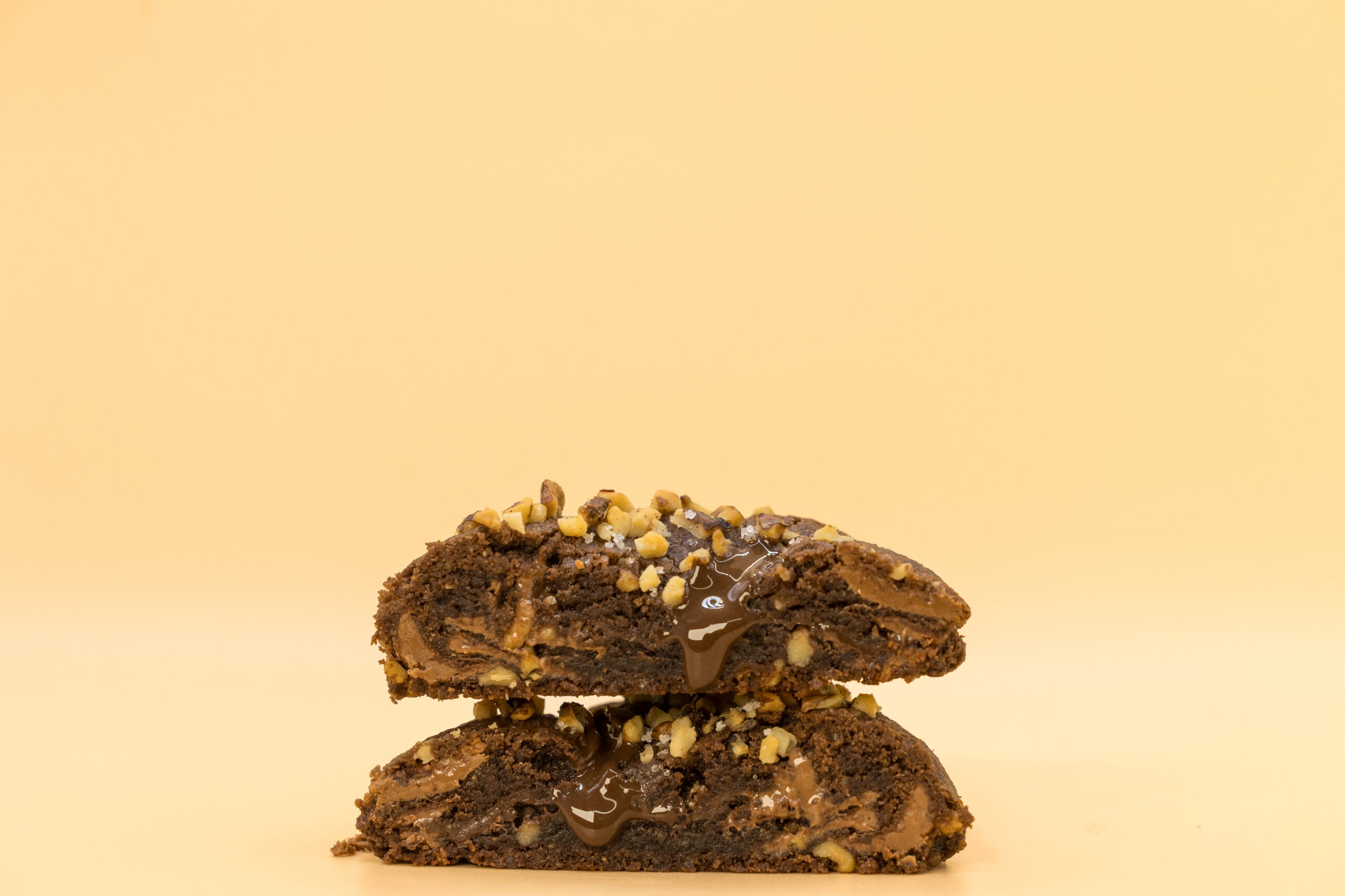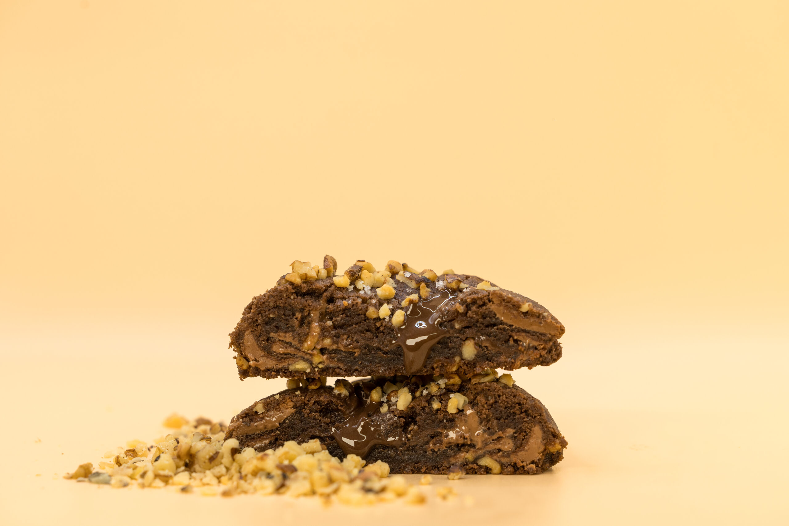 Cookie au chocolat, pépites de chocolat au lait, éclat de noix et coeur fondant chocolat.